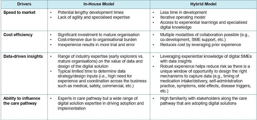 Digital is here to stay, and companies risk falling behind if they don’t advance their organizations to mature digital solutions. One strategy that companies are taking to accelerate their digital solutions, reduce risk, manage cost, and mature internal capabilities is through leveraging a hybrid model. Many companies remain skeptical of the value that digital can provide given prior industry failures and unknowns around how these assets generate revenue. Many high-value concepts fail to progress as companies struggle to calculate the ROI of digital solutions and justify investment to leadership. However, we should not look to this as the rationale to forgo greater opportunities that are outside the bounds of typical development stage gate criteria. Several products are beginning to crack the value equation and ROI, creating a competitive edge through the value of data, ability to accelerate digital solutions via hybrid models, and impact the care pathway to enhance patient care.