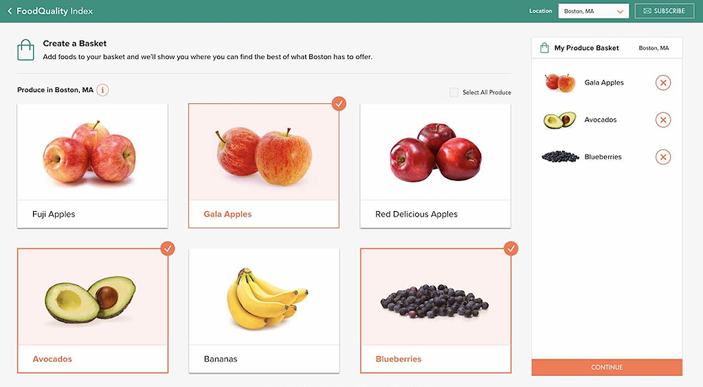 The TeakOrigin Guide enables consumers to easily search and assess both grocer and produce performance. Via the website consumers in the US and the UK can use the site to see which grocers have the best quality, value and brand perception score each and every week. They also can select individual items to get an overall produce score and recommended retailer for that item. Finally, consumers can develop a shopping basket of desired items and get a recommendation for a retailer who will provide the best quality and value for those items that particular week.